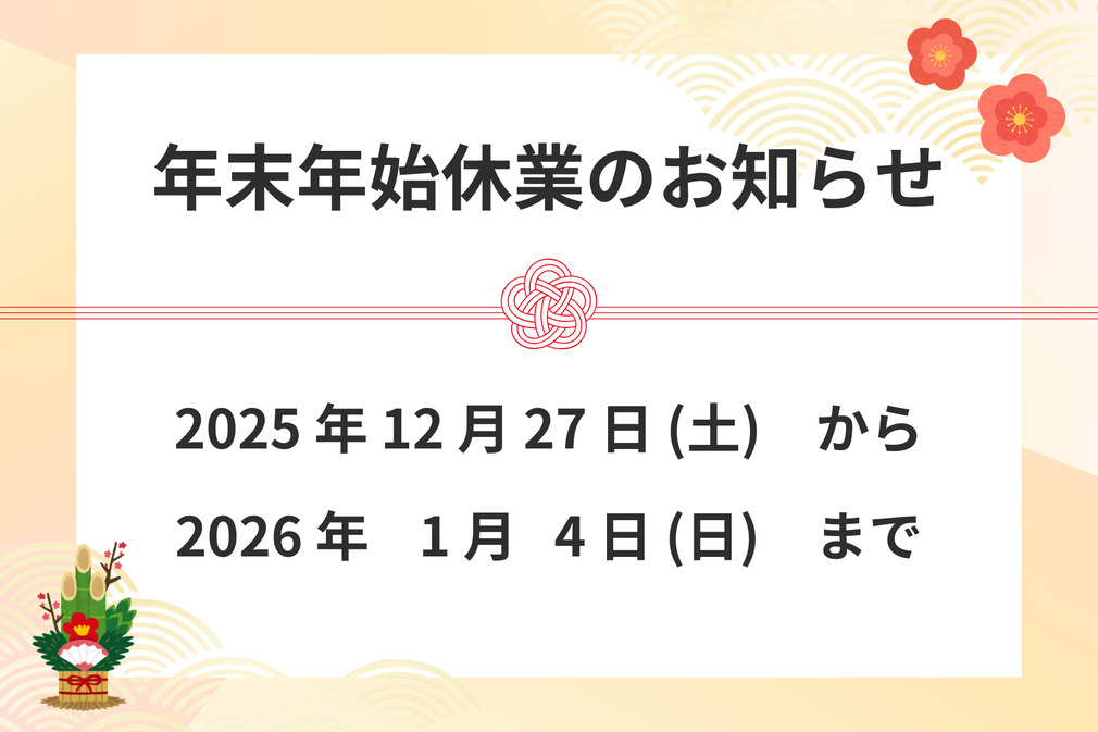 2025年12月27日(土)~2026年1月4日(日)までを年末年始の休業期間とさせていただきます。
