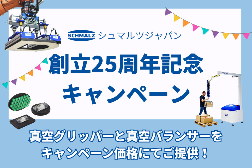 この度、シュマルツジャパン(シュマルツ株式会社)は、創立25周年を記念し、真空グリッパーおよび移動式真空バランサーを特別価格にてご提供するキャンペーンを実施いたします。