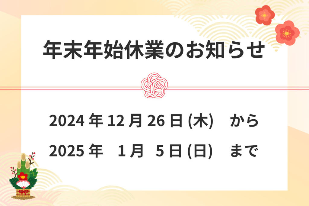 2024年12月26日(木)~2025年1月5日(日)までを年末年始の休業期間とさせていただきます。
